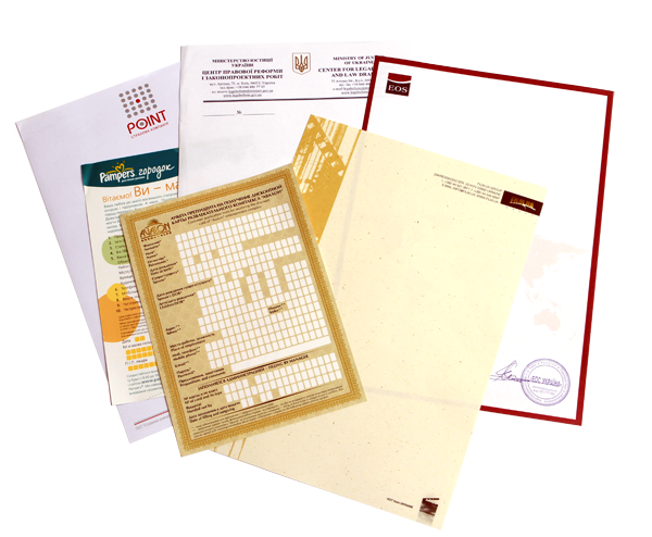 Фірмові бланки – важлива частина корпоративного стилю компанії будь-якої величини. Фірмові бланки є папір з реквізитами фірми (адресою, телефоном, електронною поштою і т.д.), логотипом компанії та іншими графічними елементами фірмового стилю. Найчастіше бланки друкують на офсетному папері, оскільки він не дає відблисків, але, за бажанням клієнта, можливе застосування спеціального дизайнерського паперу. Найбільш поширеним формат бланків – А4.
